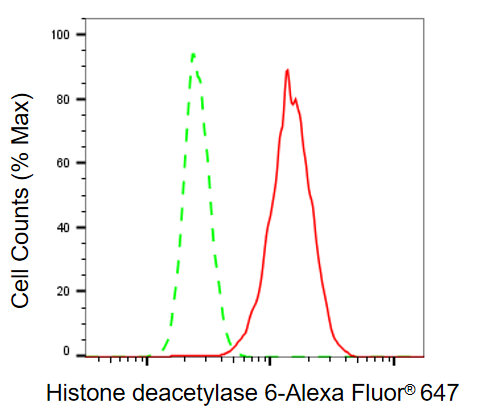 • Flow cytometric analysis of histone deacetylase 6 expression in HepG2 cells using histone deacetylase 6 antibody. Green, isotype control; red, histone deacetylase 6.