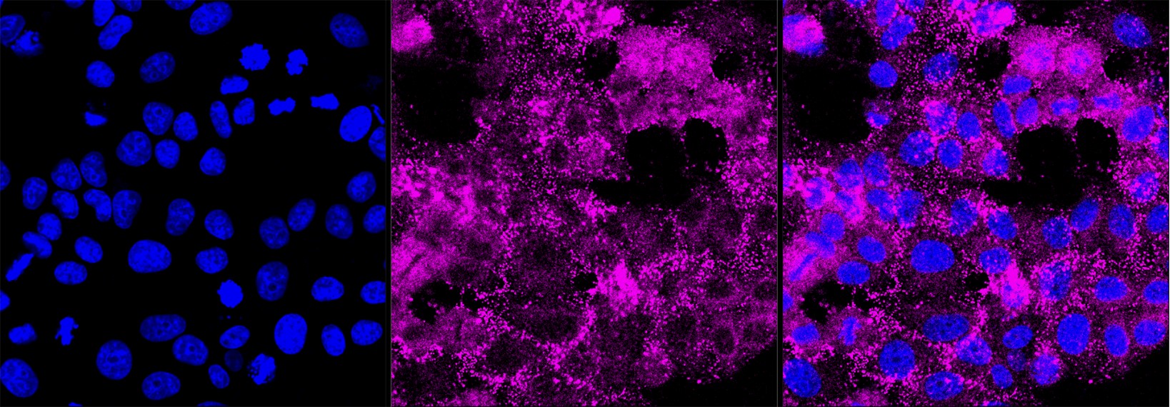 • Immunocytochemical staining of HepG2 cells with Histone deacetylase 6 antibody. Nuclei were stained blue with DAPI; Histone deacetylase 6 was stained magenta with Alexa Fluor? 647. Images were taken using Leica stellaris 5. Protein abundance based on laser Intensity and smart gain: Medium. Scale bar, 20 μm.