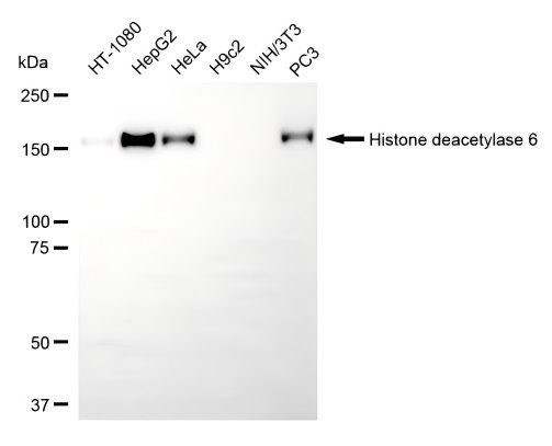 • Western blotting analysis using histone deacetylase 6 antibody. Total cell lysates (30 μg) from various cell lines were loaded and separated by SDS-PAGE. The blot was incubated with histone deacetylase 6 antibody and HRP-conjugated goat anti-rabbit secondary antibody respectively.