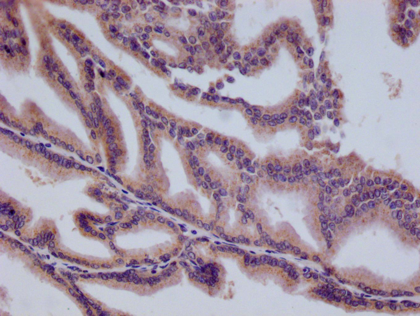 IHC image of CSB-RA167089A0HU diluted at 1:100 and staining in paraffin-embedded human prostate tissue performed on a Leica BondTM system. After dewaxing and hydration, antigen retrieval was mediated by high pressure in a citrate buffer (pH 6.0). Section was blocked with 10% normal goat serum 30min at RT. Then primary antibody (1% BSA) was incubated at 4°C overnight. The primary is detected by a Goat anti-rabbit polymer IgG labeled by HRP and visualized using 0.05% DAB.