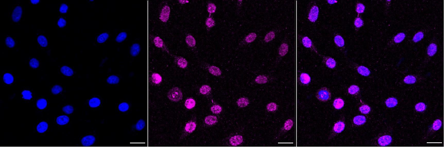 Immunocytochemical staining of HepG2 cells with HSF1 antibody (Car#4720, 1:1,000). Nuclei were stained blue with DAPI; HSF1 was stained magenta with Alexa Fluor? 647. Images were taken using Leica stellaris 5. Protein abundance based on laser Intensity and smart gain: Medium. Scale bar, 20 μm.