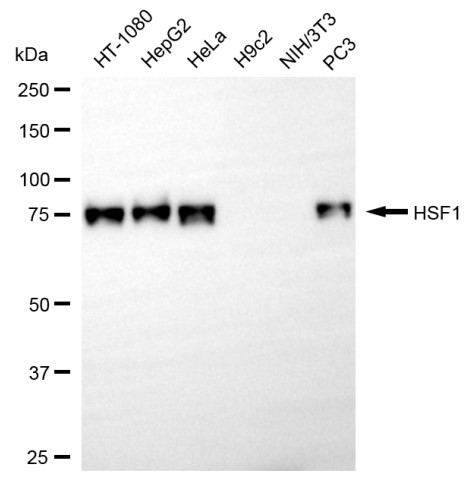 Western blotting analysis using HSF1 antibody. Total cell lysates (30 μg) from various cell lines were loaded and separated by SDS-PAGE. The blot was incubated with HSF1 antibody and HRP-conjugated goat anti-rabbit secondary antibody respectively.