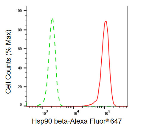 Flow cytometric analysis of Hsp90 beta expression in HepG2 cells using Hsp90 beta antibody. Green, isotype control; red, Hsp90 beta.