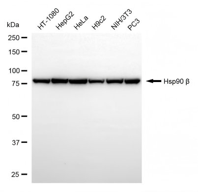 Western blotting analysis using Hsp90 beta antibody. Total cell lysates (30 μg) from various cell lines were loaded and separated by SDS-PAGE. The blot was incubated with Hsp90 beta antibody and HRP-conjugated goat anti-rabbit secondary antibody respectively.