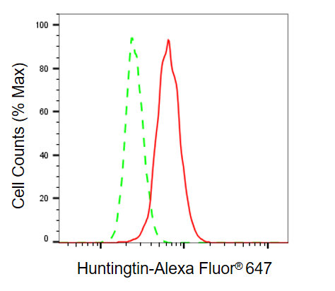 Flow cytometric analysis of huntingtin expression in HepG2 cells using huntingtin antibody. Green, isotype control; red, huntingtin.