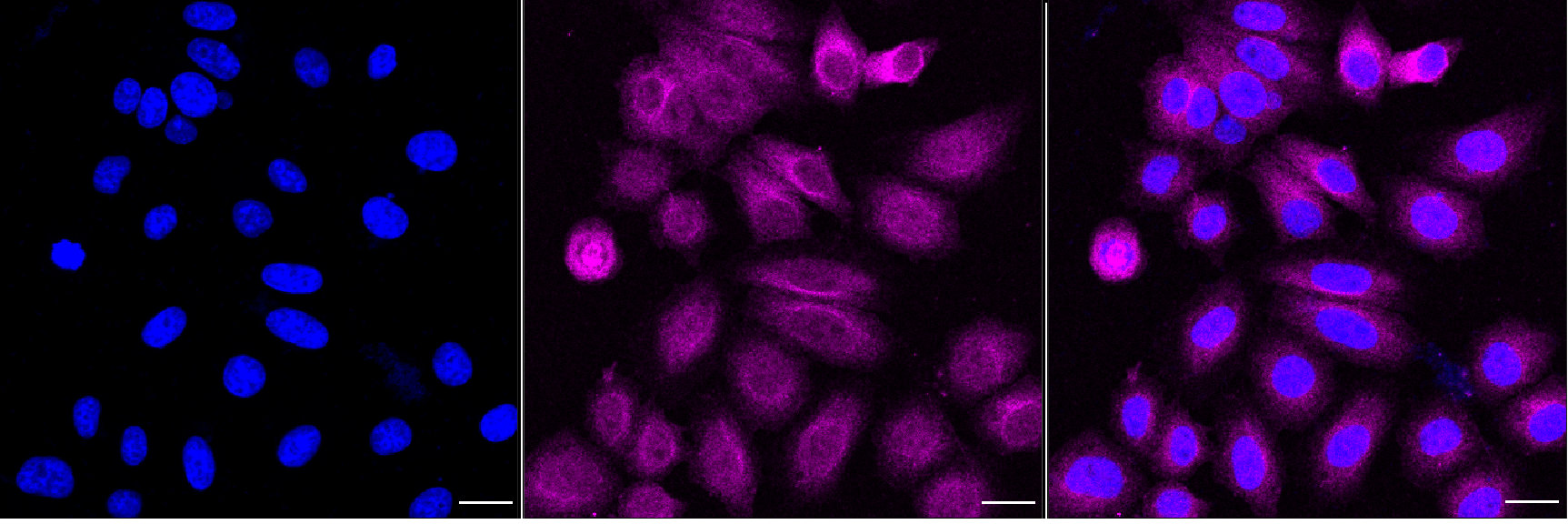 Immunocytochemical staining of HepG2 cells with huntingtin antibody. Nuclei were stained blue with DAPI; Huntingtin was stained magenta with Alexa Fluor? 647. Images were taken using Leica stellaris 5. Protein abundance based on laser Intensity and smart gain: Medium. Scale bar, 20 μm.