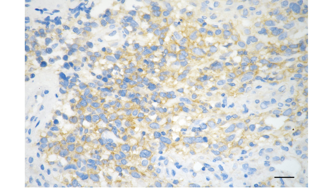 Immunohistochemistry was performed on paraffin-embedded human glioblastoma using huntingtin antibody. Antigen retrieval was done in sodium citrate buffer (pH 6.0). DAB was used for detection, with hematoxylin counterstaining. Images were acquired using a Nikon Ci-L Plus microscope (40× objective). Scale bar: 25 μm.