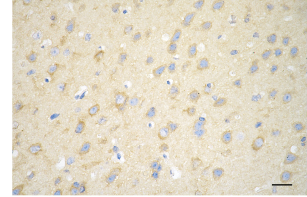 Immunohistochemistry was performed on paraffin-embedded mouse brain using huntingtin antibody. Antigen retrieval was done in sodium citrate buffer (pH 6.0). DAB was used for detection, with hematoxylin counterstaining. Images were acquired using a Nikon Ci-L Plus microscope (40× objective). Scale bar: 25 μm.