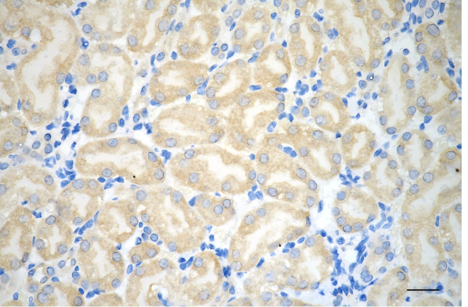 Immunohistochemistry was performed on paraffin-embedded mouse kidney using huntingtin antibody. Antigen retrieval was done in sodium citrate buffer (pH 6.0). DAB was used for detection, with hematoxylin counterstaining. Images were acquired using a Nikon Ci-L Plus microscope (40× objective). Scale bar: 25 μm.