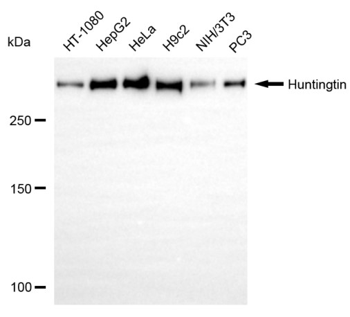 Western blotting analysis using huntingtin antibody. Total cell lysates (30 μg) from various cell lines were loaded and separated by SDS-PAGE. The blot was incubated with huntingtin antibody and HRP-conjugated goat anti-rabbit secondary antibody respectively.