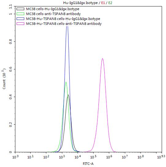 Untransfected MC38 cells and transfected Human TSPAN8 MC38 stable cells were stained with Human IgG1&Igκ Isotype Control (CSB-RA011156MA1HU) and anti-TSPAN8 antibody (CSB-RA025166MA1HU) (2μg/1*106cells), washed and then followed by FITC-conjugated anti-Human IgG Fc antibody and analyzed with flow cytometry.
