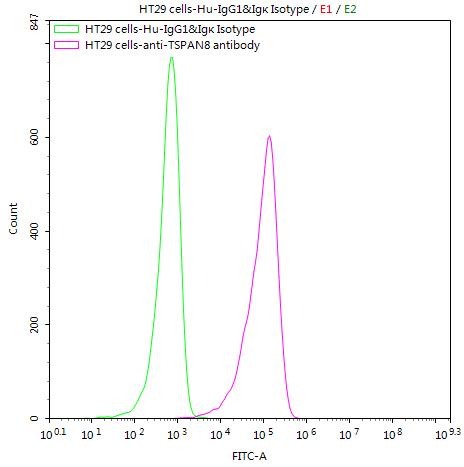 HT29 cells were stained with Human IgG1&Igκ Isotype Control (CSB-RA011156MA1HU)(green line) and anti-TSPAN8 antibody (CSB-RA882142MA1HU) (2μg/1*106cells) (red line), washed and then followed by FITC-conjugated anti-Human IgG Fc antibody and analyzed with flow cytometry.