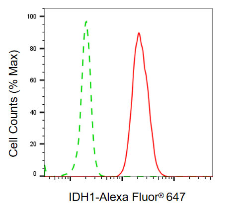 Flow cytometric analysis of IDH1 expression in C2C12 cells using IDH1 antibody. Green, isotype control; red, IDH1.