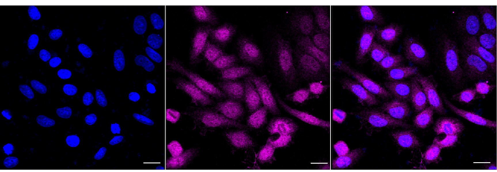 Immunocytochemical staining of HepG2 cells with IDH1 antibody. Nuclei were stained blue with DAPI; IDH1 was stained magenta with Alexa Fluor? 647. Images were taken using Leica stellaris 5. Protein abundance based on laser Intensity and smart gain: Medium. Scale bar, 20 μm.
