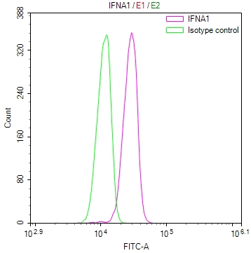 • Overlay Peak curve showing Hela cells stained with CSB-RA365592MA1HU (red line) at 1:100. The cells were fixed in 4% formaldehyde and permeated by 0.2% TritonX-100 for 10min. Then 10% normal goat serum to block non-specific protein-protein interactions followed by the antibody (1ug/1*106cells) for 45min at 4℃. The secondary antibody used was Fluorescein (FITC) AffiniPure Goat Anti-Human IgG, Fcγ fragment specific at 1:200 dilution for 35min at 4℃.Control antibody (green line) was human IgG1 (1ug/1*106cells) used under the same conditions. Acquisition of >10,000 events was performed.