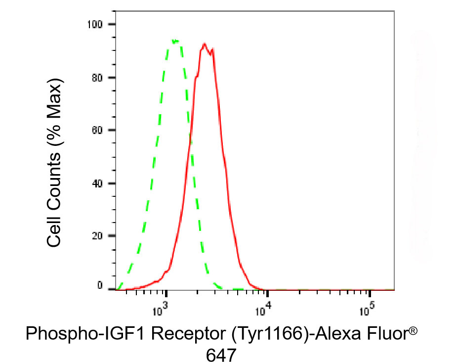 Flow cytometric analysis of Phospho-IGF1 Receptor (Tyr1166) expression in HAP-1 cells using Phospho-IGF1 Receptor (Tyr1166) antibody. Green, isotype control; red, Phospho-IGF1 Receptor (Tyr1166).
