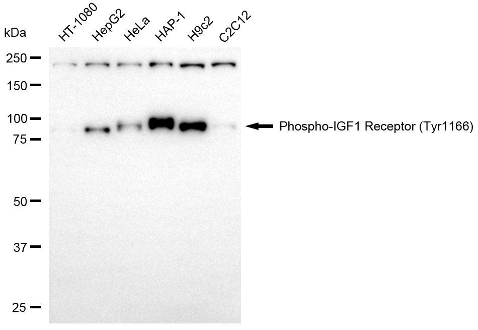 Western blotting analysis using phospho-IGF1 Receptor (Tyr1166) antibody. Total cell lysates (20 μg) from various cell lines were loaded and separated by SDS-PAGE. The blot was incubated with phospho-IGF1 Receptor (Tyr1166) antibody and HRP-conjugated goat anti-rabbit secondary antibody respectively.