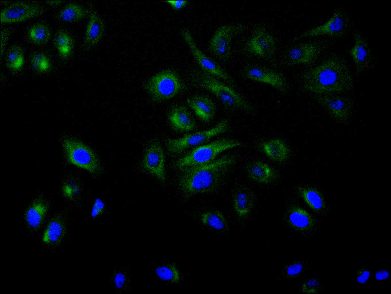 Immunofluorescence staining of Hela cell with CSB-RA554340A0HU at 1:50, counter-stained with DAPI. The cells were fixed in 4% formaldehyde, permeabilized using 0.2% Triton X-100 and blocked in 10% normal Goat Serum. The cells were then incubated with the antibody overnight at 4°C. The secondary antibody was Alexa Fluor 488-congugated AffiniPure Goat Anti-Rabbit IgG(H+L).