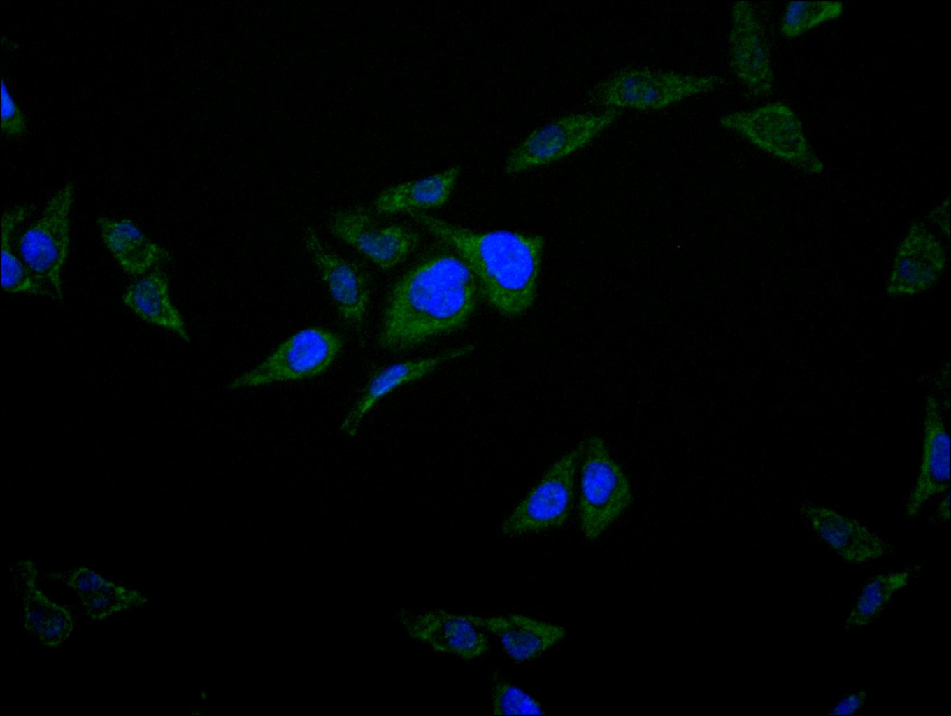 Immunofluorescence staining of Hela cell with CSB-RA931025A0HU at 1:50, counter-stained with DAPI. The cells were fixed in 4% formaldehyde, permeabilized using 0.2% Triton X-100 and blocked in 10% normal Goat Serum. The cells were then incubated with the antibody overnight at 4°C. The secondary antibody was Alexa Fluor 488-congugated AffiniPure Goat Anti-Rabbit IgG(H+L).