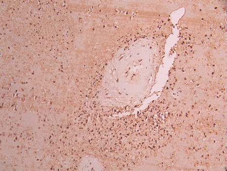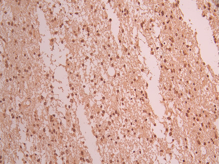 IHC image of CSB-RA552120A0HU diluted at 1:100 and staining in paraffin-embedded human glioma cancer performed on a Leica BondTM system. After dewaxing and hydration, antigen retrieval was mediated by high pressure in a citrate buffer (pH 6.0). Section was blocked with 10% normal goat serum 30min at RT. Then primary antibody (1% BSA) was incubated at 4°C overnight. The primary is detected by a Goat anti-rabbit polymer IgG labeled by HRP and visualized using 0.05% DAB.