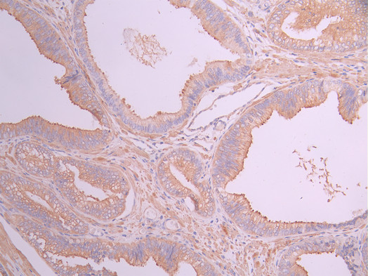 • IHC image of CSB-RA184907A0HU diluted at 1:100 and staining in paraffin-embedded human prostate cancer performed on a Leica BondTM system. After dewaxing and hydration, antigen retrieval was mediated by high pressure in a citrate buffer (pH 6.0). Section was blocked with 10% normal goat serum 30min at RT. Then primary antibody (1% BSA) was incubated at 4°C overnight. The primary is detected by a Goat anti-rabbit polymer IgG labeled by HRP and visualized using 0.05% DAB.