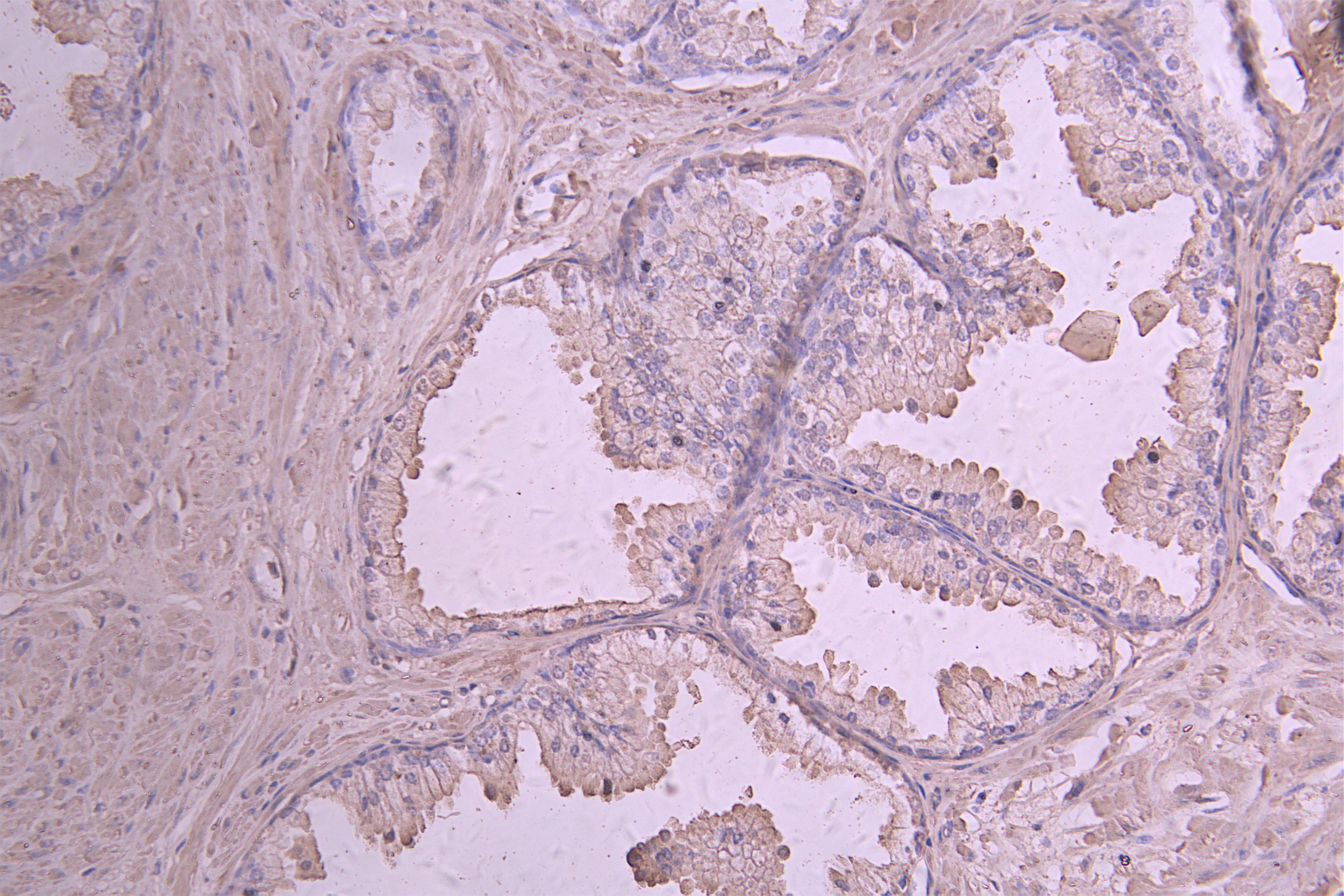 • IHC image of CSB-RA011586MA1HU diluted at 1:50 and staining in paraffin-embedded human prostate cancer performed on a Leica BondTM system. After dewaxing and hydration, antigen retrieval was mediated by high pressure in a citrate buffer (pH 6.0). Section was blocked with 10% normal goat serum 30min at RT. Then primary antibody (1% BSA) was incubated at 4°C overnight. The primary is detected by a Goat anti-human polymer IgG labeled by HRP and visualized using 0.05% DAB.