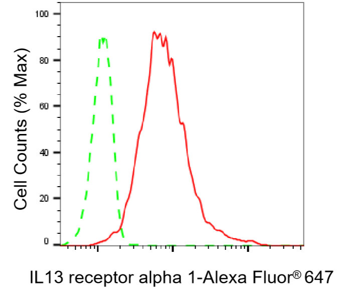 Flow cytometric analysis of IL13 receptor alpha 1 expression in HepG2 cells using IL13 receptor alpha 1 antibody. Green, isotype control; red, IL13 receptor alpha 1.