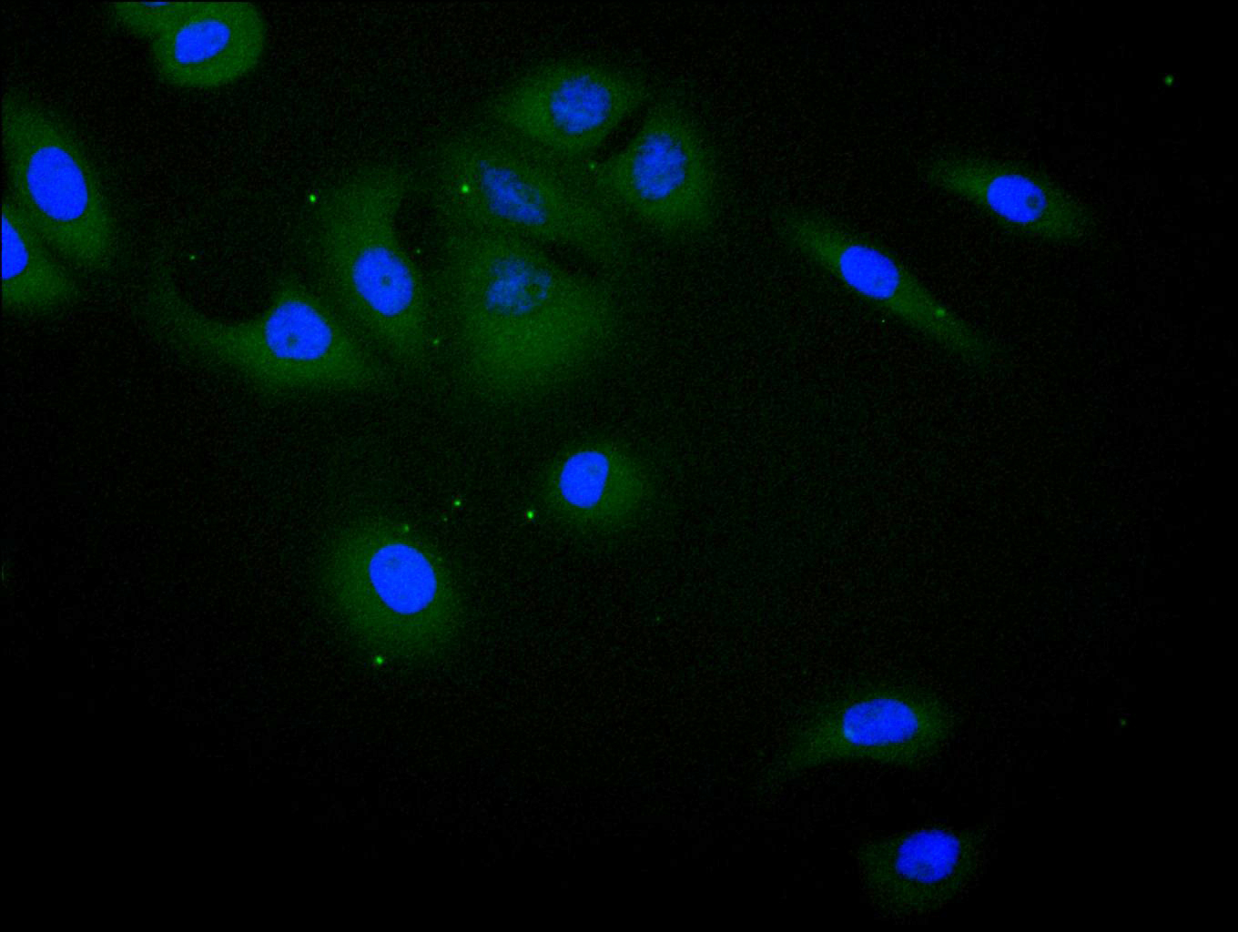• Immunofluorescence staining of A549 cell with CSB-RA011593MA1HU at 1:100, counter-stained with DAPI. The cells were fixed in 4% formaldehyde and blocked in 10% normal Goat Serum. The cells were then incubated with the antibody overnight at 4C. The secondary antibody was FITC-conjugated AffiniPure Goat Anti-Human IgG(H+L).