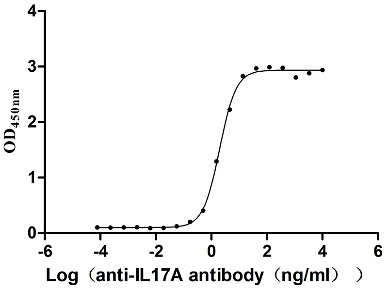 功能:Effector cytokine of innate and adaptive immune system involved in antimicrobial host defense and maintenance of tissue integrity. Signals via IL17RA-IL17RC heterodimeric receptor complex, triggering homotypic interaction of IL17RA and IL17RC chains with TRAF3IP2 adapter. This leads to downstream TRAF6-mediated activation of NF-kappa-B and MAPkinase pathways ultimately resulting in transcriptional activation of cytokines, chemokines, antimicrobial peptides and matrix metalloproteinases, with potential strong immune inflammation. Plays an important role in connecting T cell-mediated adaptive immunity and acute inflammatory response to destroy extracellular bacteria and fungi. As a signature effector cytokine of T-helper 17 cells (Th17), primarily induces neutrophil activation and recruitment at infection and inflammatory sites. In airway epithelium, mediates neutrophil chemotaxis via induction of CXCL1 and CXCL5 chemokines. In secondary lymphoid organs, contributes to germinal center formation by regulating the chemotactic response of B cells to CXCL12 and CXCL13, enhancing retention of B cells within the germinal centers, B cell somatic hypermutation rate and selection toward plasma cells. Effector cytokine of a subset of gamma-delta T cells that functions as part of an inflammatory circuit downstream IL1B, TLR2 and IL23A-IL12B to promote neutrophil recruitment for efficient bacterial clearance. Effector cytokine of innate immune cells including invariant natural killer cell (iNKT) and group 3 innate lymphoid cells that mediate initial neutrophilic inflammation. Involved in the maintenance of the integrity of epithelial barriers during homeostasis and pathogen infection. Upon acute injury, has a direct role in epithelial barrier formation by regulating OCLN localization and tight junction biogenesis. As part of the mucosal immune response induced by commensal bacteria, enhances host's ability to resist pathogenic bacterial and fungal infections by promoting neutrophil recruitment and antimicrobial peptides release. In synergy with IL17F, mediates the production of antimicrobial beta-defensins DEFB1, DEFB103A, and DEFB104A by mucosal epithelial cells, limiting the entry of microbes through the epithelial barriers. Involved in antiviral host defense through various mechanisms. Enhances immunity against West Nile virus by promoting T cell cytotoxicity. May play a beneficial role in influenza A virus (H5N1) infection by enhancing B cell recruitment and immune response in the lung. Contributes to influenza A virus (H1N1) clearance by driving the differentiation of B-1a B cells, providing for production of virus-specific IgM antibodies at first line of host defense.