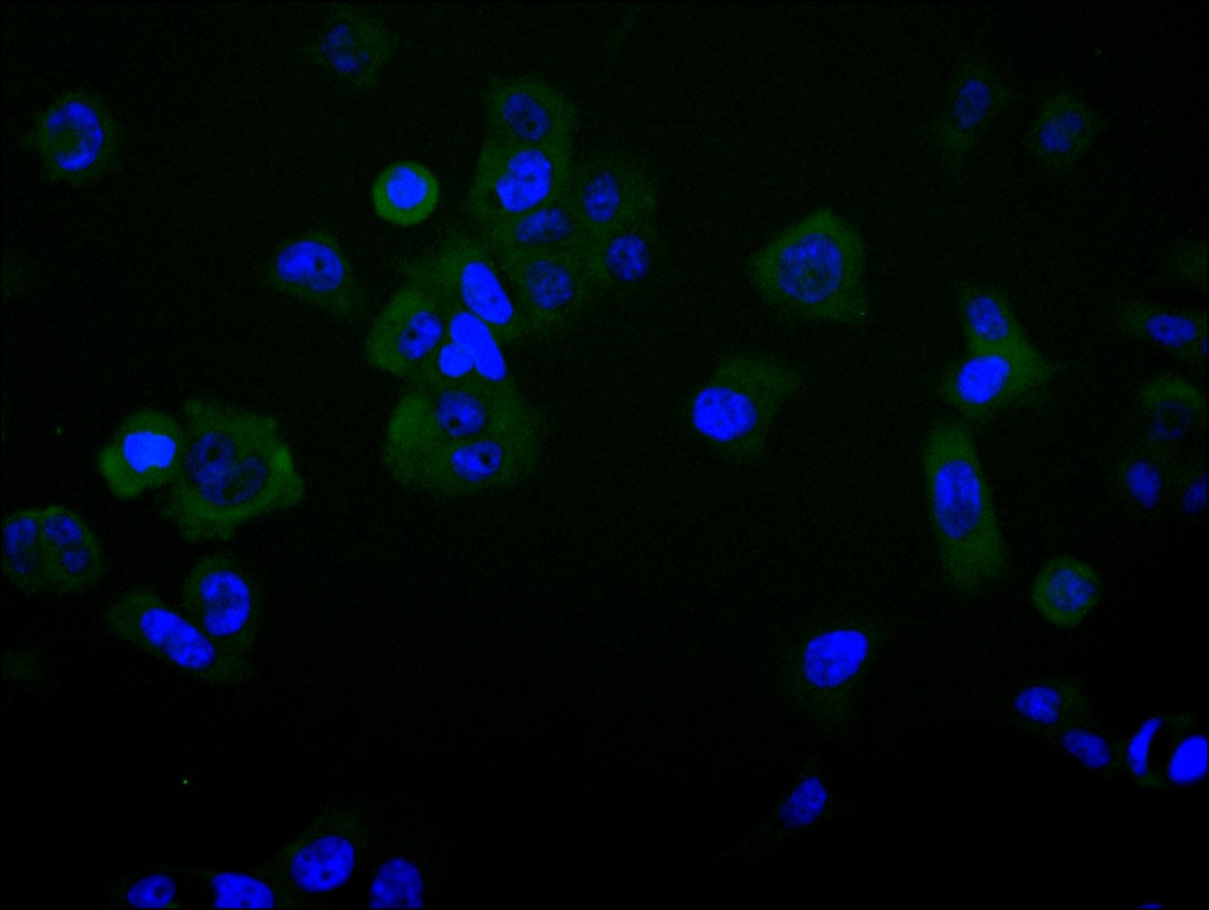 • Immunofluorescence staining of MCF-7 cell with CSB-RA733162MA1HU at 1:30 ,counter-stained with DAPI. The cells were fixed in 4% formaldehyde and blocked in 10% normal Goat Serum. The cells were then incubated with the antibody overnight at 4°C. The secondary antibody was Fluorescein (FITC) AffiniPure Goat Anti-Human IgG, Fcγ fragment specific.