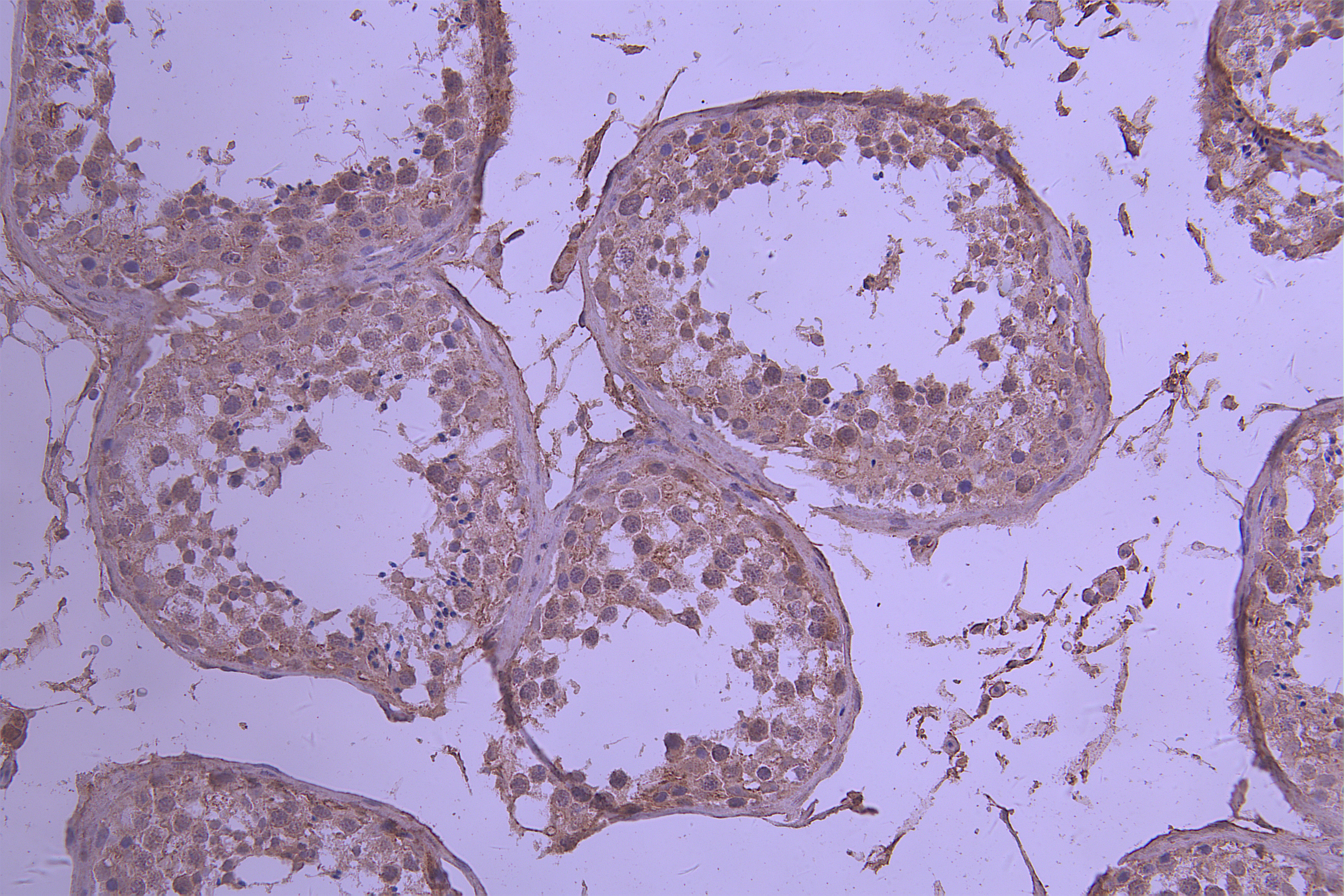 • IHC image of CSB-RA733162MA1HU diluted at 1:50 and staining in paraffin-embedded human testis tissue performed on a Leica BondTM system. After dewaxing and hydration, antigen retrieval was mediated by high pressure in a citrate buffer (pH 6.0). Section was blocked with 10% normal goat serum 30min at RT. Then primary antibody (1% BSA) was incubated at 4°C overnight. The primary is detected by a Anti-Human lgG, Fcy Fragment Specific labeled by HRP and visualized using 0.05% DAB.
