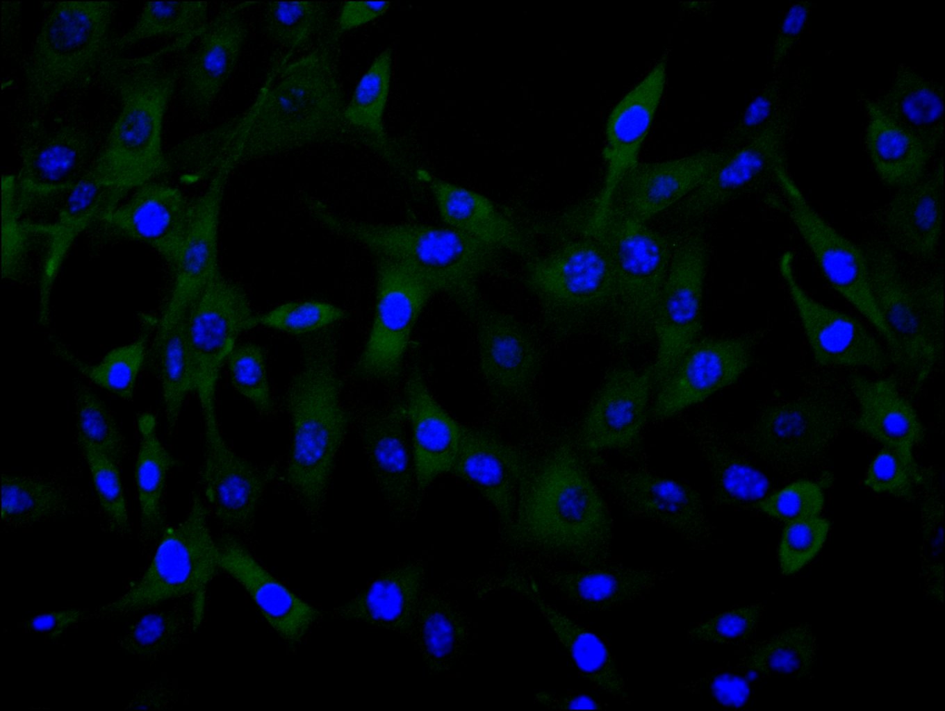 Immunofluorescence staining of NIH/3T3 cell with CSB-RA011664MA3HU at 1:30 ,counter-stained with DAPI. The cells were fixed in 4% formaldehyde, permeabilized using 0.2% Triton X-100 and blocked in 10% normal Goat Serum. The cells were then incubated with the antibody overnight at 4°C. The secondary antibody was Fluorescein (FITC) AffiniPure Goat Anti-Human IgG, Fcγ fragment specific.