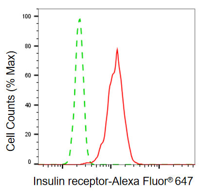Flow cytometric analysis of insulin receptor expression in HT-1080 cells using insulin receptor antibody. Green, isotype control; red, insulin receptor.
