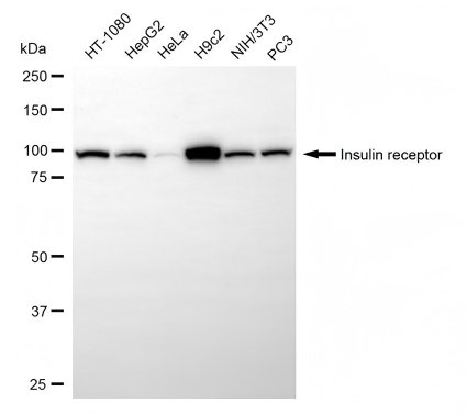 Western blotting analysis using insulin receptor antibody. Total cell lysates (30 μg) from various cell lines were loaded and separated by SDS-PAGE. The blot was incubated with insulin receptor antibody and HRP-conjugated goat anti-rabbit secondary antibody respectively.