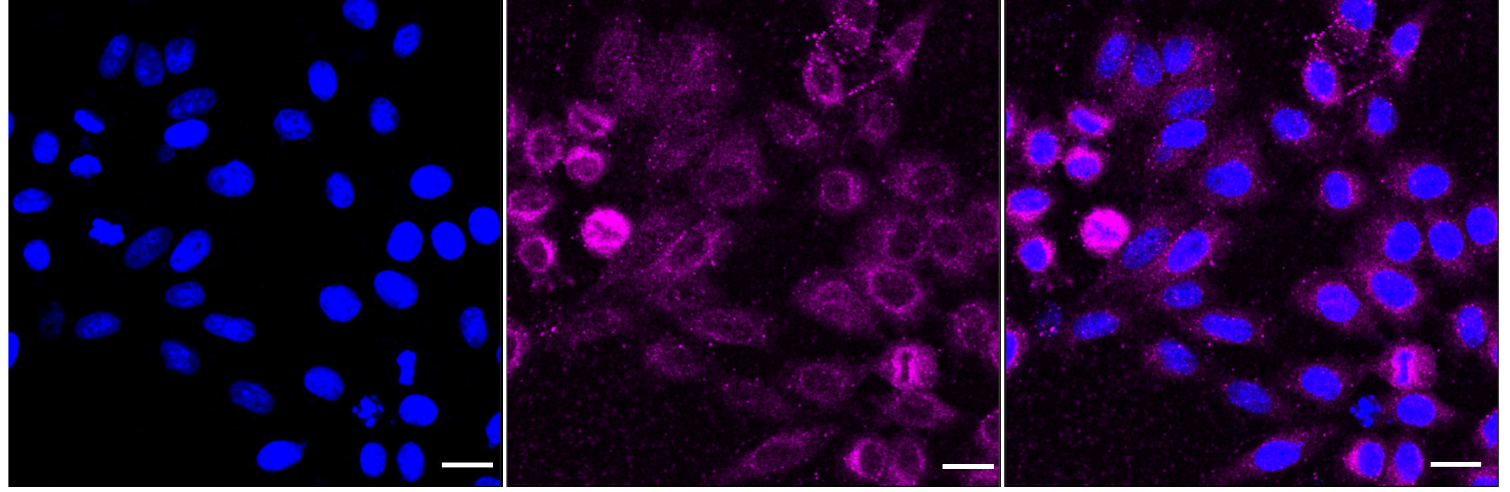 Immunocytochemical staining of HepG2 cells with IRAK1 antibody. Nuclei were stained blue with DAPI; IRAK1 was stained magenta with Alexa Fluor? 647. Images were taken using Leica stellaris 5. Protein abundance based on laser Intensity and smart gain: Medium. Scale bar: 20 μm.