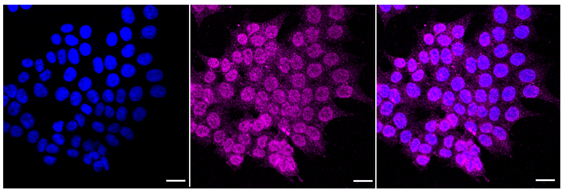 • Immunocytochemical staining of HAP-1 cells with Integrin subunit alpha 4 antibody. Nuclei were stained blue with DAPI; Integrin subunit alpha 4 was stained magenta with Alexa Fluor? 647. Images were taken using Leica stellaris 5. Protein abundance based on laser Intensity and smart gain: Medium. Scale bar: 20 μm.