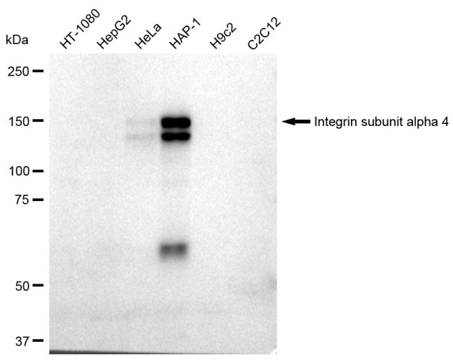 • Western blotting analysis using Integrin subunit alpha 4 antibody. Total cell lysates (30 μg) from various cell lines were loaded and separated by SDS-PAGE. The blot was incubated with Integrin subunit alpha 4 antibody and HRP-conjugated goat anti-rabbit secondary antibody respectively. Image was developed using FeQ? ECL Substrate Kit