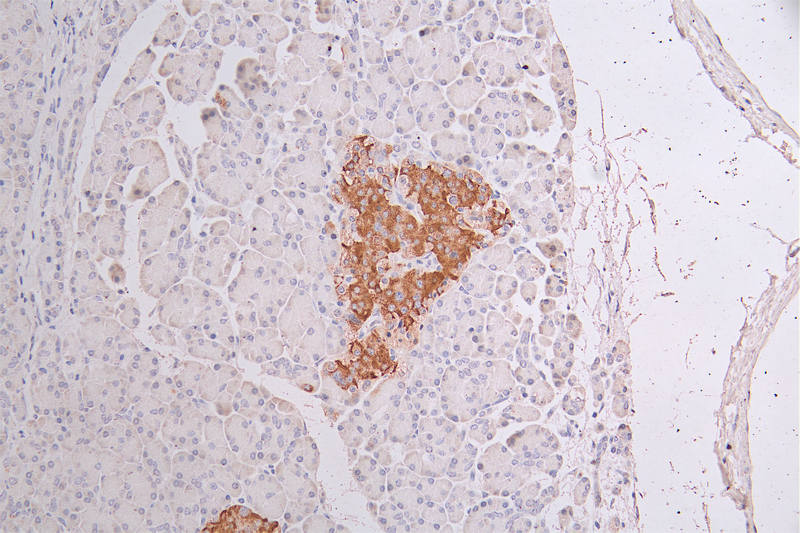 IHC image of CSB-RA582749A0HU diluted at 1:50 and staining in paraffin-embedded human pancreati tissue performed on a Leica BondTM system. After dewaxing and hydration, antigen retrieval was mediated by high pressure in a citrate buffer (pH 6.0). Section was blocked with 10% normal goat serum 30min at RT. Then primary antibody (1% BSA) was incubated at 4°C overnight. The primary is detected by a Goat anti-rabbit polymer IgG labeled by HRP and visualized using 0.34% DAB.