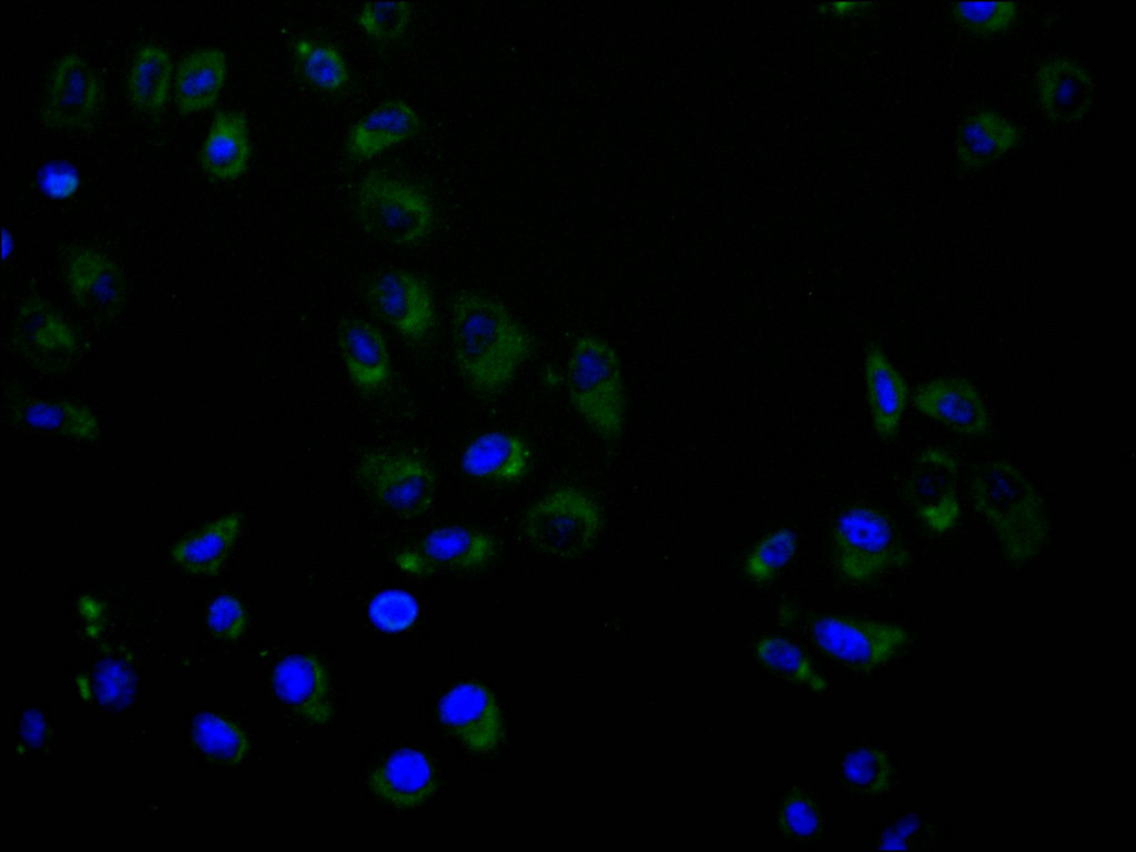 • Immunofluorescence staining of Hela cell with CSB-RA051003A0HU at 1:50, counter-stained with DAPI. The cells were fixed in 4% formaldehyde and blocked in 10% normal Goat Serum. The cells were then incubated with the antibody overnight at 4°C. The secondary antibody was Alexa Fluor 488-congugated AffiniPure Goat Anti-Rabbit IgG(H+L).