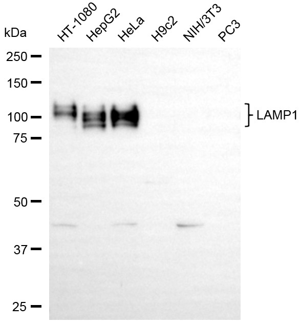 • Western blotting analysis using LAMP1 antibody. Total cell lysates (30 μg) from various cell lines were loaded and separated by SDS-PAGE. The blot was incubated with LAMP1 antibody and HRP-conjugated goat anti-rabbit secondary antibody respectively.