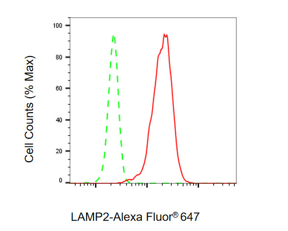 Flow cytometric analysis of LAMP2 expression in HeLa cells using LAMP2 antibody. Green, isotype control; red, LAMP2.