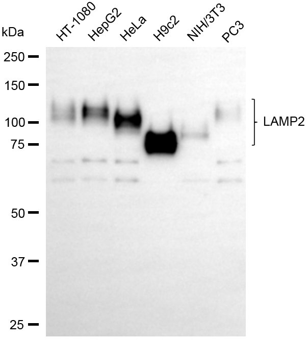 Western blotting analysis using LAMP2 antibody. Total cell lysates (30 μg) from various cell lines were loaded and separated by SDS-PAGE. The blot was incubated with LAMP2 antibody and HRP-conjugated goat anti-rabbit secondary antibody respectively.
