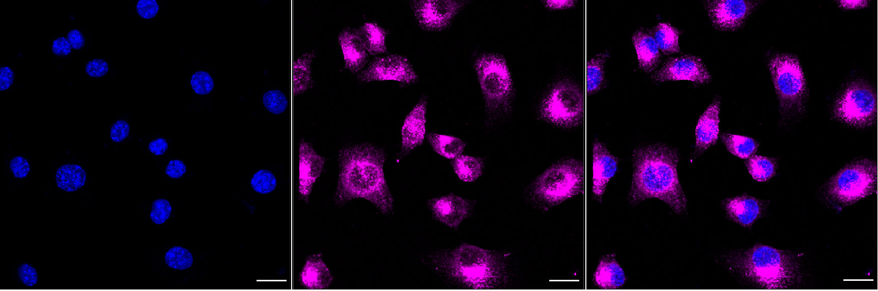 Immunocytochemical staining of C2C12 cells with LDL receptor related protein 1 antibody. Nuclei were stained blue with DAPI; LDL receptor related protein 1 was stained magenta with Alexa Fluor? 647. Images were taken using Leica stellaris 5. Protein abundance based on laser Intensity and smart gain: Medium. Scale bar, 20 μm.