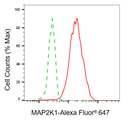 Flow cytometric analysis of MAP2K1 expression in HepG2 cells using MAP2K1 antibody. Green, isotype control; red, MAP2K1.