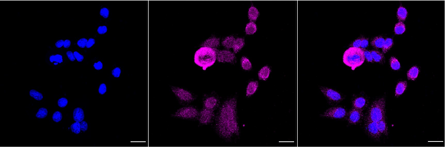 Immunocytochemical staining of HepG2 cells with MAP2K1 antibody . Nuclei were stained blue with DAPI; MAP2K1 was stained magenta with Alexa Fluor? 647. Images were taken using Leica stellaris 5. Protein abundance based on laser Intensity and smart gain: Medium. Scale bar, 20 μm.
