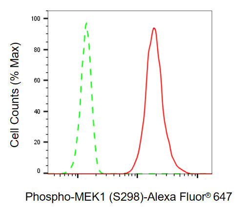 Flow cytometric analysis of phospho-MEK1 (S298) expression in C2C12 cells using phospho-MEK1 (S298) antibody. Green, isotype control; red, phospho-MEK1 (S298).