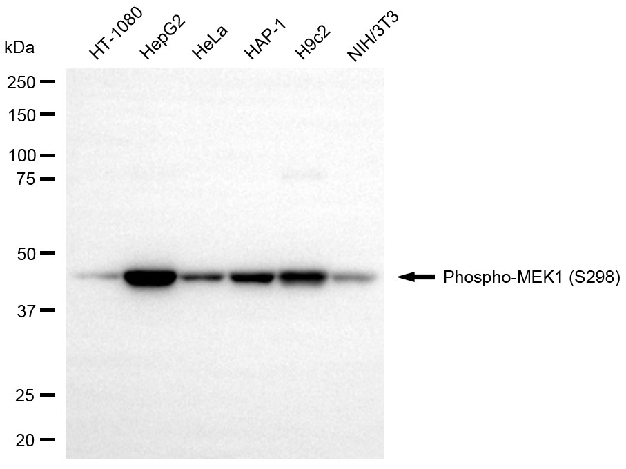Western blotting analysis using phospho-MEK1 (S298) antibody. Total cell lysates (30 μg) from various cell lines were loaded and separated by SDS-PAGE. The blot was incubated with phospho-MEK1 (S298) antibody and HRP-conjugated goat anti-rabbit secondary antibody respectively.
