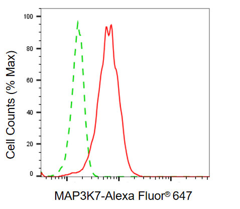 • Flow cytometric analysis of MAP3K7 expression in HeLa cells using MAP3K7 antibody. Green, isotype control; red, MAP3K7.