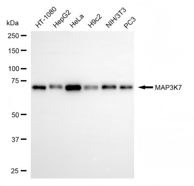 • Western blotting analysis using MAP3K7 antibody. Total cell lysates (30 μg) from various cell lines were loaded and separated by SDS-PAGE. The blot was incubated with MAP3K7 antibody and HRP-conjugated goat anti-rabbit secondary antibody respectively.