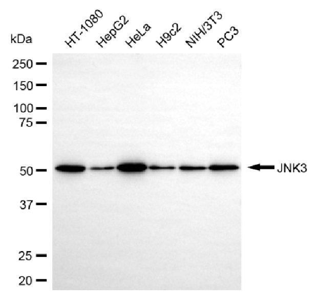 Western blotting analysis using JNK3 antibody. Total cell lysates (30 μg) from various cell lines were loaded and separated by SDS-PAGE. The blot was incubated with JNK3 antibody and HRP-conjugated goat anti-rabbit secondary antibody respectively.